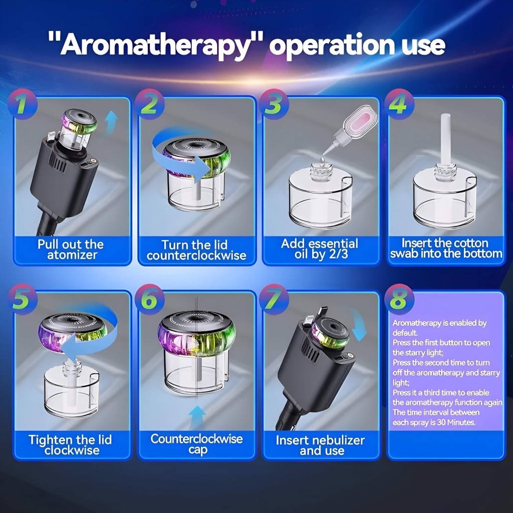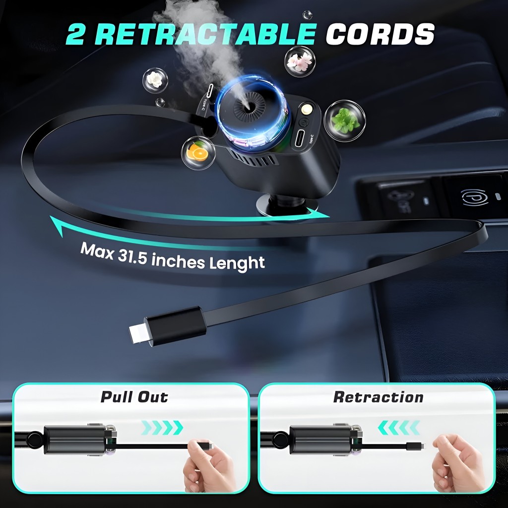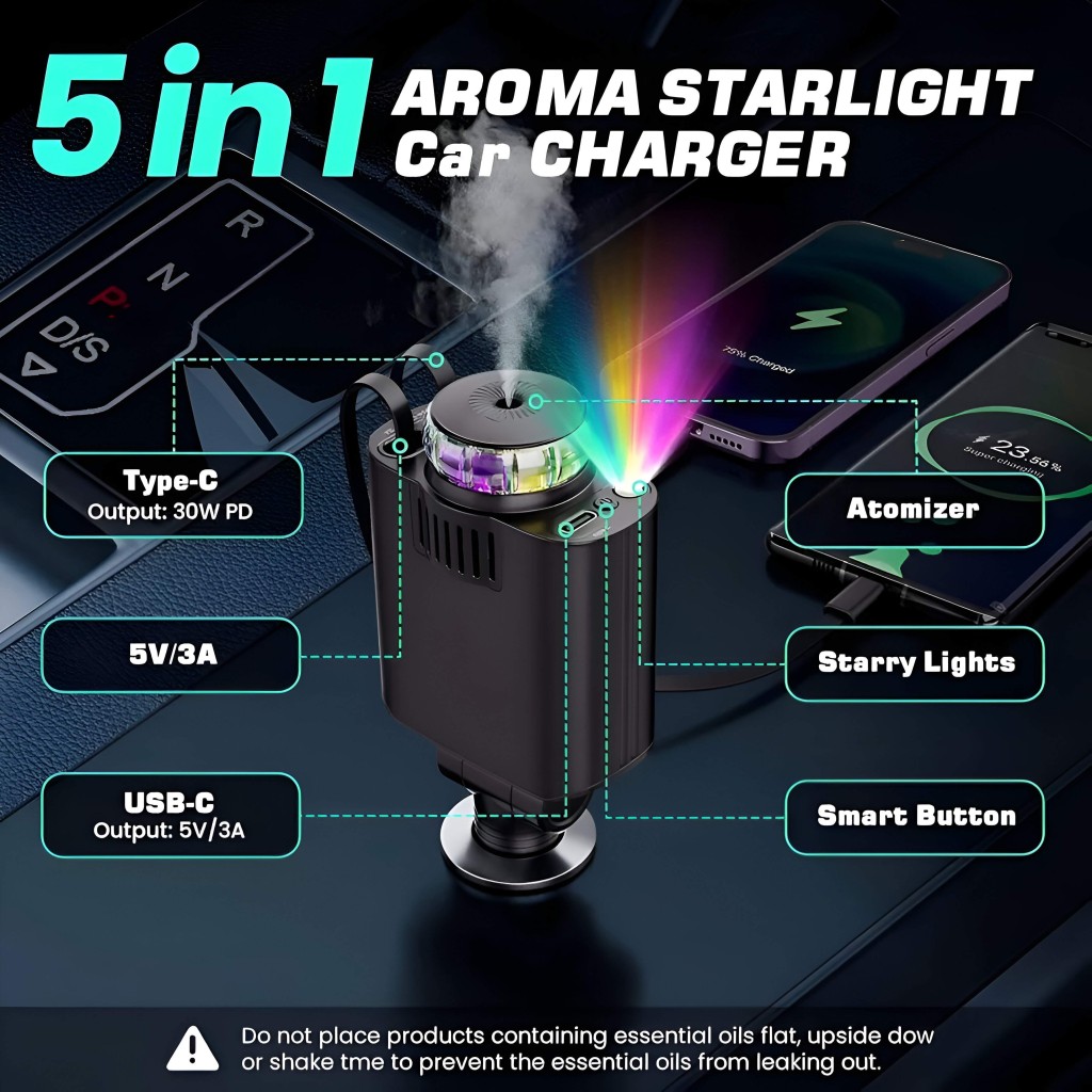 شارژر Starlight مجهز به اتومایزر داخلی و ۳ بطری اسانس مخصوص است که فضای داخل خودرو را همیشه خوشبو و دلپذیر نگه میدارد. تنها کافیست عطر دلخواه خود را داخل مخزن بریزید تا در طول مسیر، هوایی مطبوع و آرامشبخش را تجربه کنید.